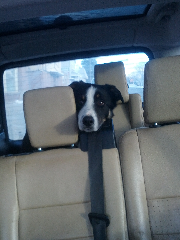So the police officer and I drive across town. We pull into where his hay shed is and there is Bo- chained up with a deer carcass next to him for him to eat! I do not think he has ever been so happy to see someone! When I told him to "load up", he jumped right in and looked at me like let's get the hell out of here!
